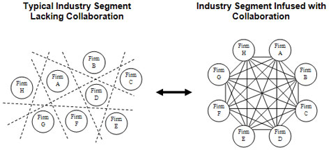While the collaborating eight-firm industry segment shown above would provide 140 (28 interconnecting lines x 5 types of collaboration) additional ways of generating wealth beyond that possible in a non-collaborative segment, a more typical thirty five-firm segment would offer 2800 (560 x 5) additional ways of generating wealth, upon establishment of inter-firm collaboration. On a global basis, inter-firm collaboration could annually generate many trillions of dollars of additional wealth.